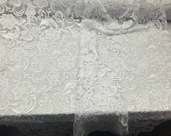 White floral design embroider and corded on a mesh lace fabric--sold by the yard.