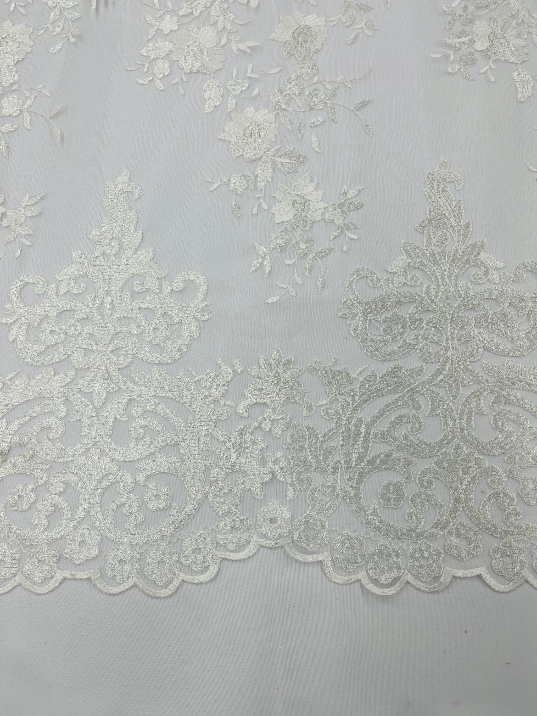 This beautiful fabric is embroider on a 2 way stretch mesh. The lace stretches on the width. This lace has a beautiful border on both sides of the width and beautifully stitch all over .The lace can be use for dresses, tablecloths, runners, decoration, skirts, jackets, nightgowns, prom dresses and much more.