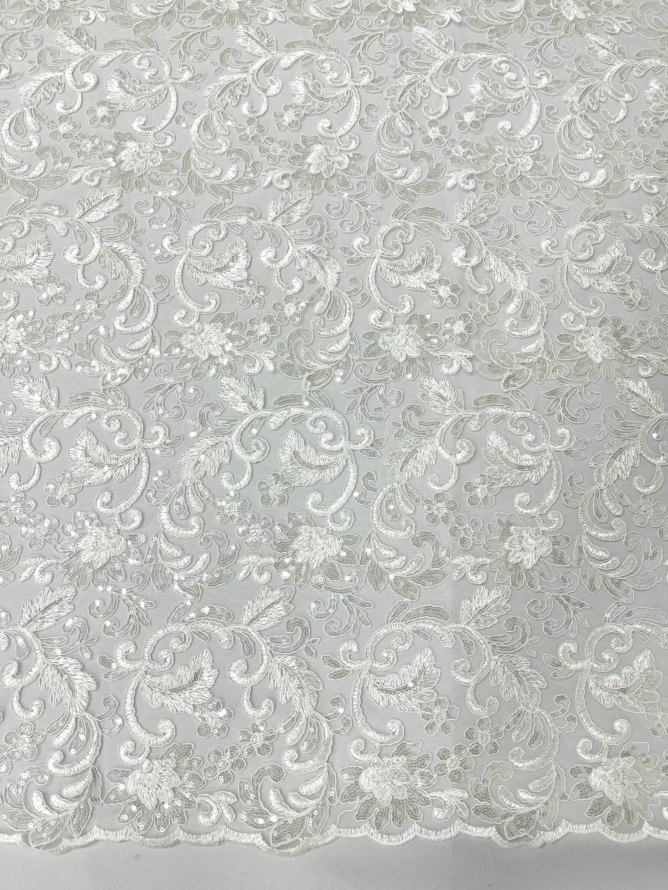 These corded flowers are embroider with sequins on a mesh lace fabric giving off a sophisticated and elegant look . The lace has a double scallops on the width.This lace can be used for dresses, tablecloths, nightgowns, prom gowns, bridal gowns, wedding gowns, runners, Vegas shows, pillows, decoration, and much more.