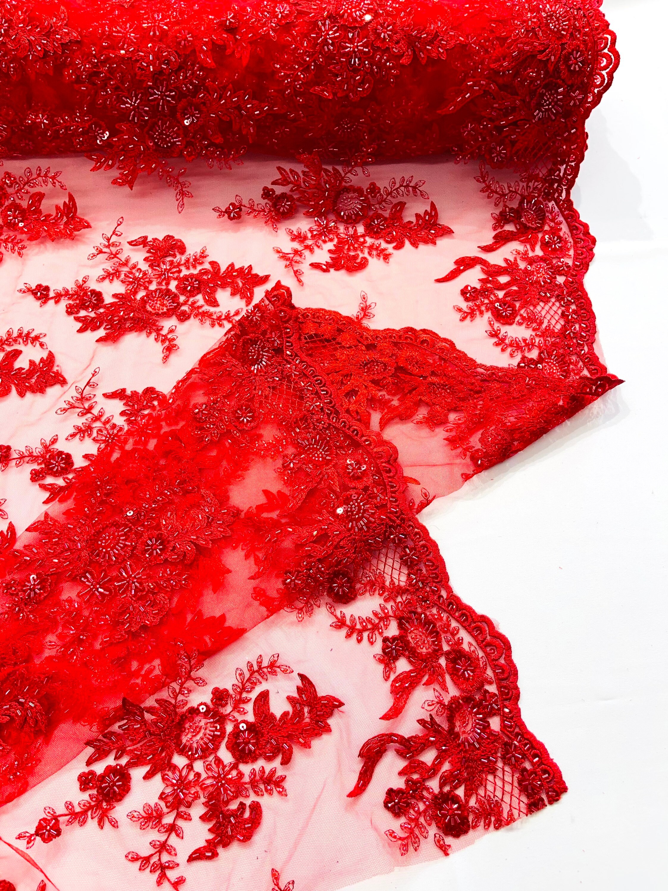 French design embroidered and hand beading on a mesh lace. This lace is hand beaded with sequins and glass beads. The lace has a Metallic tread that gives it that especial shine. The lace can be use for dresses, tablecloths, night gowns, Skirts, prom dresses, wedding dresses, runners for tables,decoration and much more.